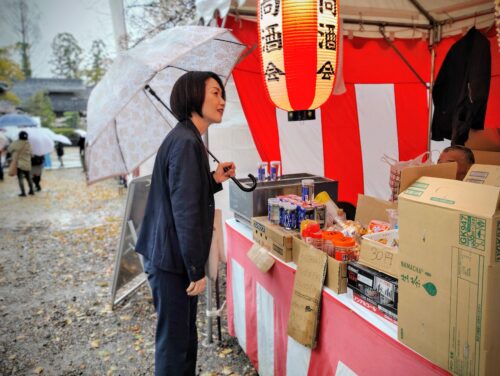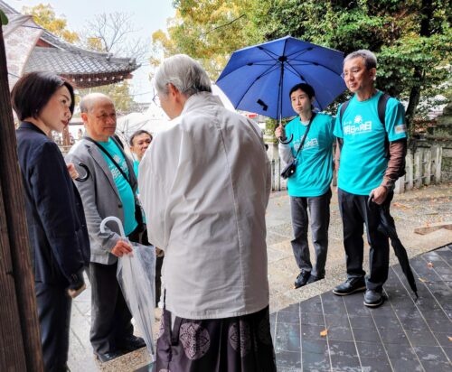 道々でも神社でも市民の方と対話する杉谷・林 両市議会議員とメンバー。